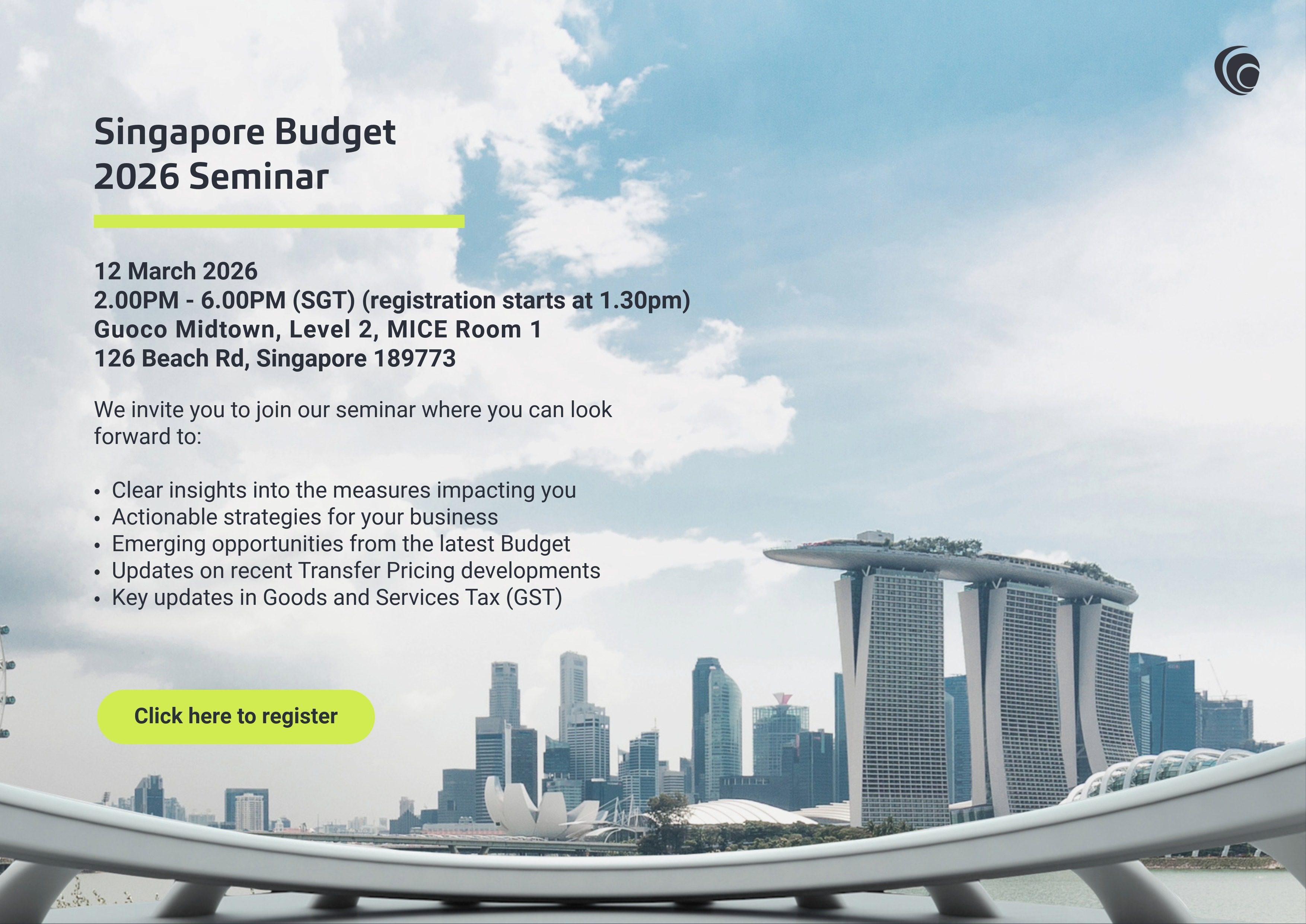 Join us in our Singapore Budget 2026 Seminar, where you will gain in-depth insights into key measures impacting your business, along with practical strategies to navigate these changes effectively.Â