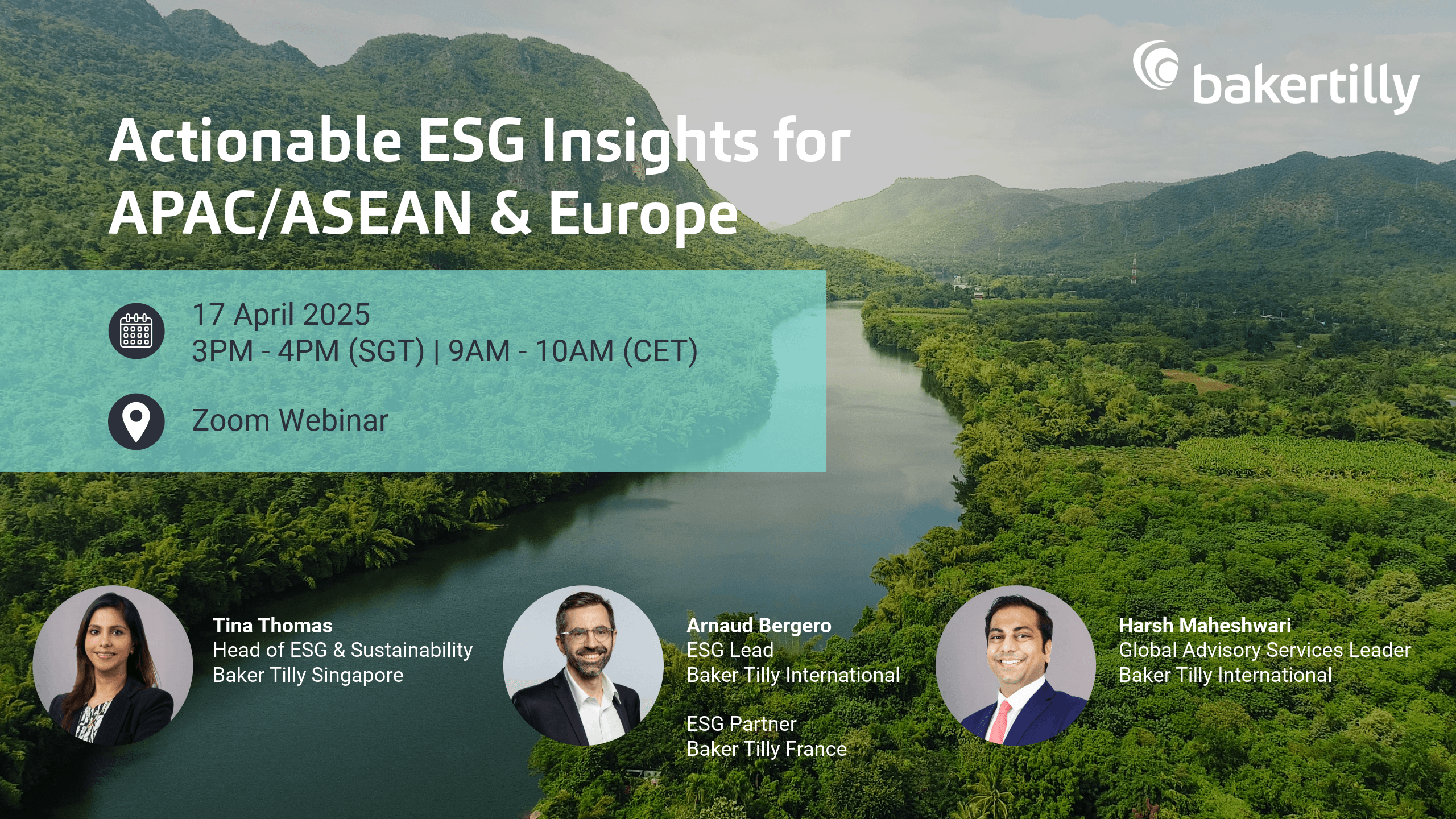 This session will feature Tina Thomas, Head of ESG & Sustainability, Baker Tilly Singapore, Arnaud Bergero, ESG Lead, Baker Tilly International and Partner, Baker Tilly France, and Harsh Maheshwari, Global Advisory Services Leader, Baker Tilly International.