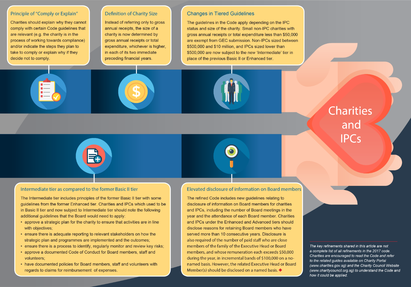 The key refinements shared in this article are not a complete list of all refinements in the 2017 Code. Charities are encouraged to read the Code and refer to the related guides available on Charity Portal (www.charities.gov.sg) and the Charity Council Website (www.charitycouncil.org.sg) to understand the Code and how it could be applied.
